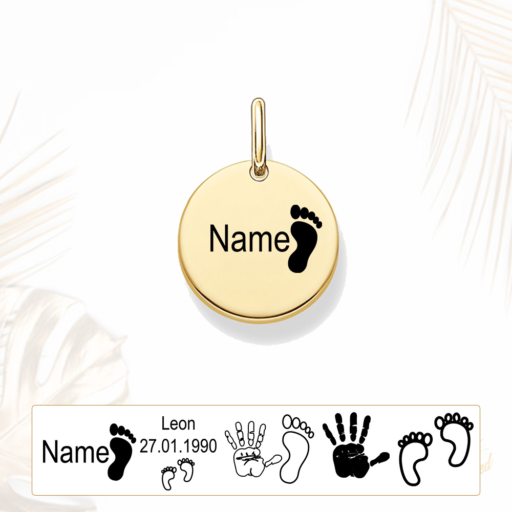 Gestalte deinen runden Anhänger mit einem Fußabdruck oder Handabdruck und Namen oder Datum nach Wunsch – kunstvoll graviert für ein einzigartiges und persönliches Schmuckstück, das du täglich bei dir tragen kannst. Die Rückseite bietet Platz für eine weitere individuelle Gravur, wie ein besonderes Datum oder eine Botschaft, die dir am Herzen liegt.