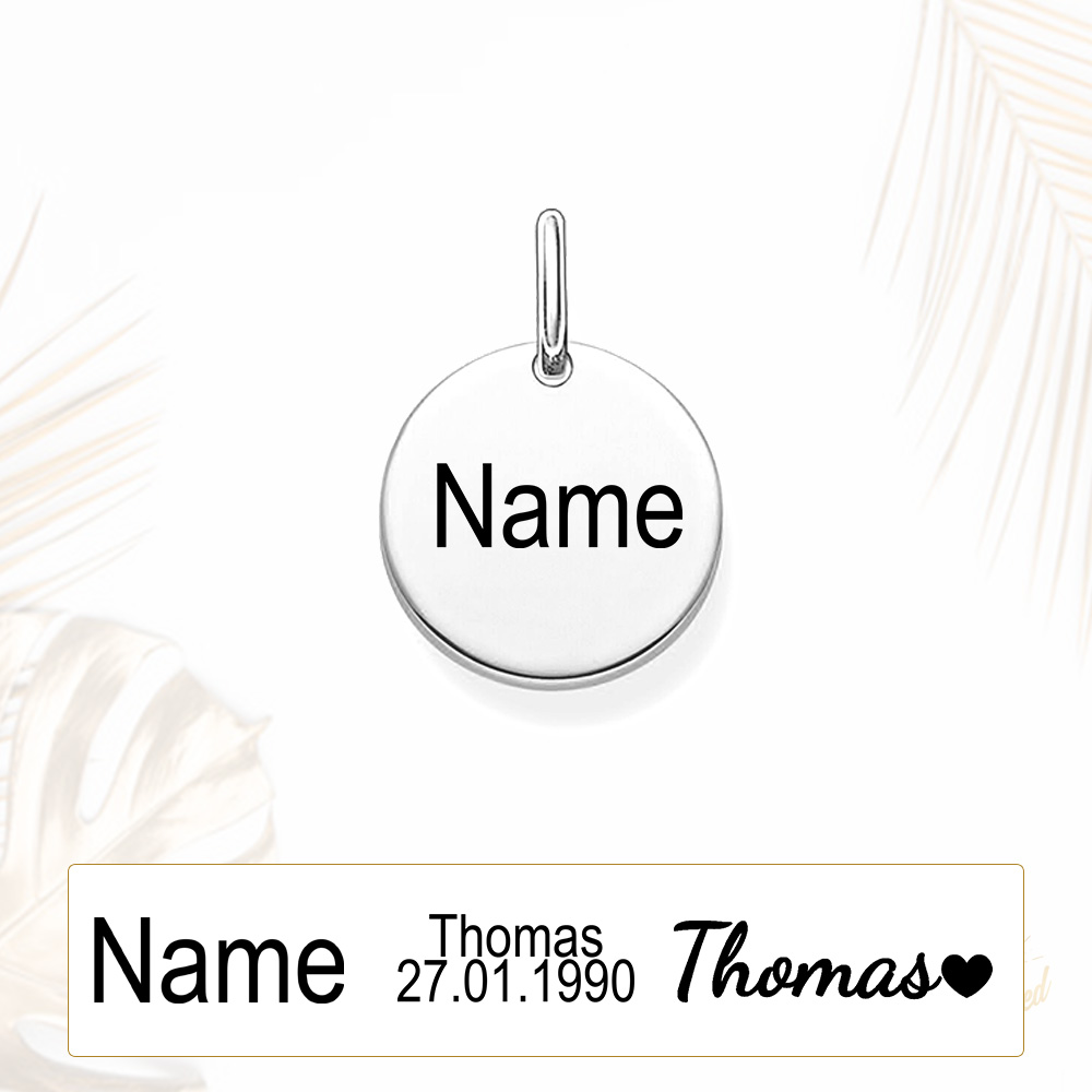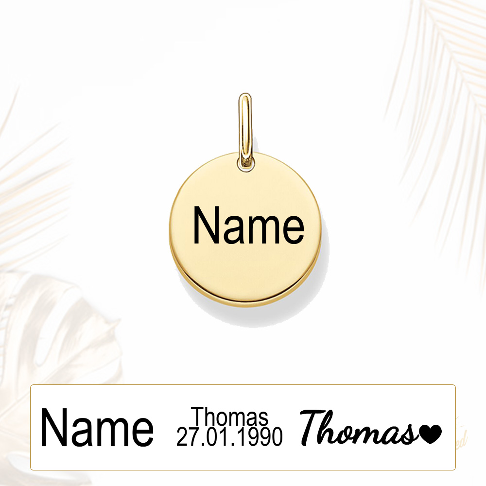 Gestalte deinen runden Anhänger mit deinem eigenen Namen – kunstvoll graviert für ein einzigartiges und persönliches Schmuckstück, das du täglich bei dir tragen kannst. Die Rückseite bietet Platz für eine weitere individuelle Gravur, wie ein besonderes Datum oder eine Botschaft, die dir am Herzen liegt.